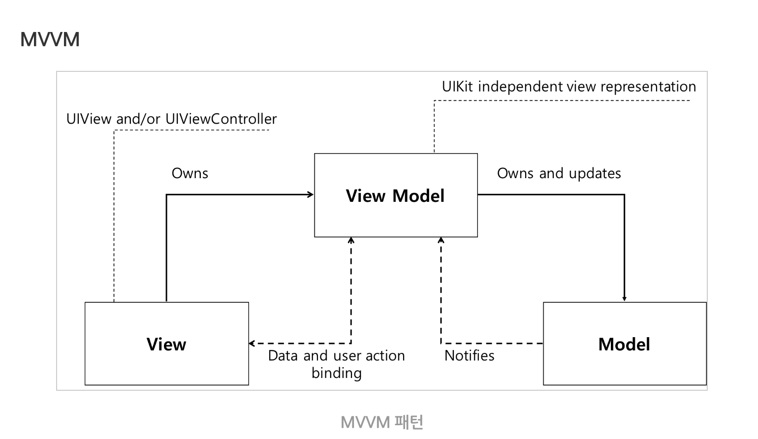 데이터 바인딩의 개념은 쉽게 말해 Model과 UI 요소 간의 싱크를 맞춰주는 것이라 할 수 있다(정확히 말하면 UI 데이터 바인딩이지만 iOS를 다루기 때문에 이것을 다룬다).