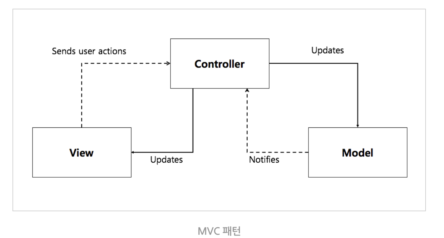 Controller가 다리 역할이 되어 View의 입력을 Model에 반영하고 Model의 변화에 맞게 View를 갱신합니다.