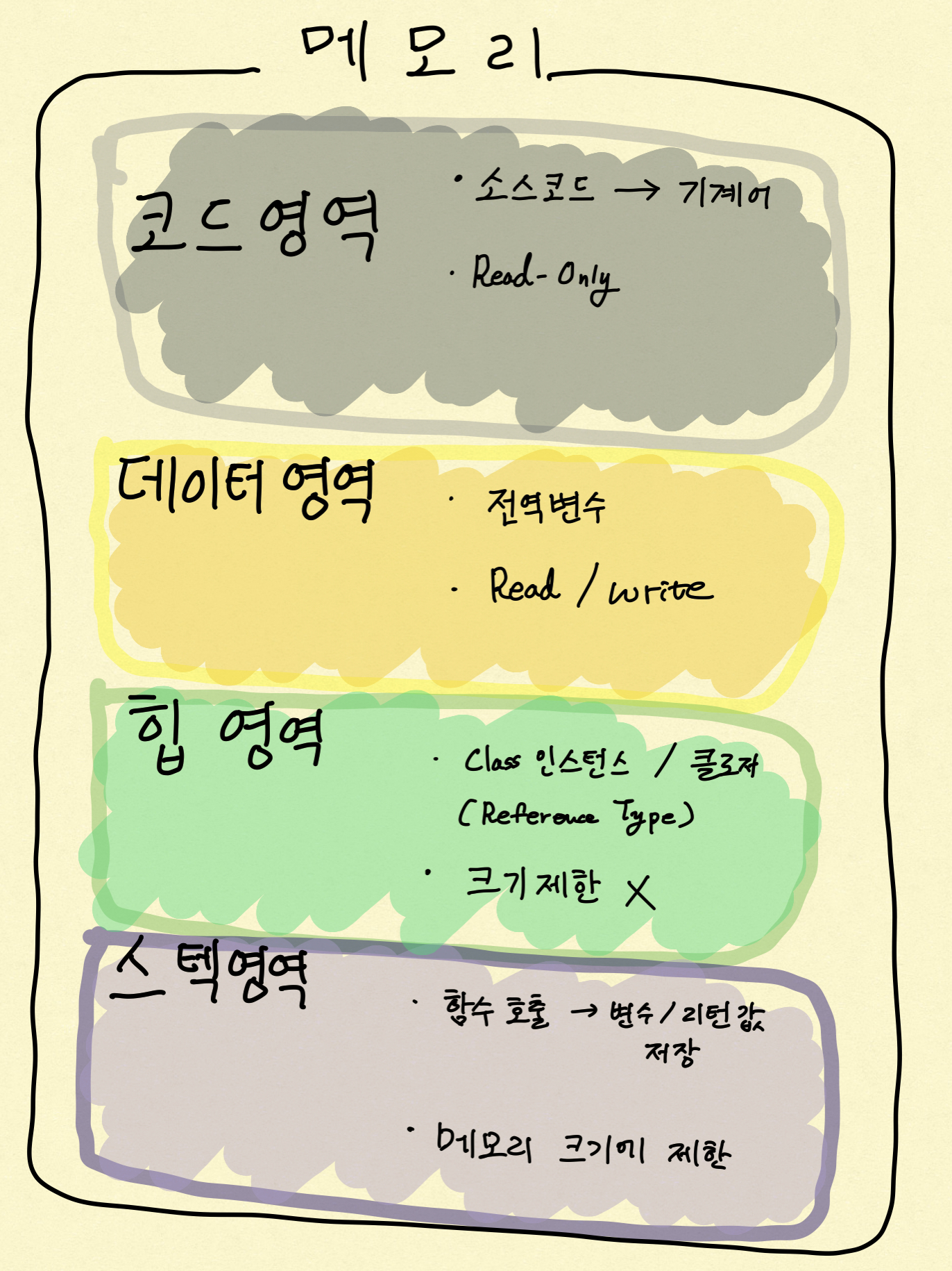 그 이유는 같은 메모리 영역을 공유하고 있기 때문입니다! 같은 공간의 메모리 영역을 공유하면서 데이터 크기를 모르거나 스택에 저장하기엔 큰 데이터는 힙에 할당, 그외는 스택에 할당되는 상부상조(?) 같은 느낌인거죠.